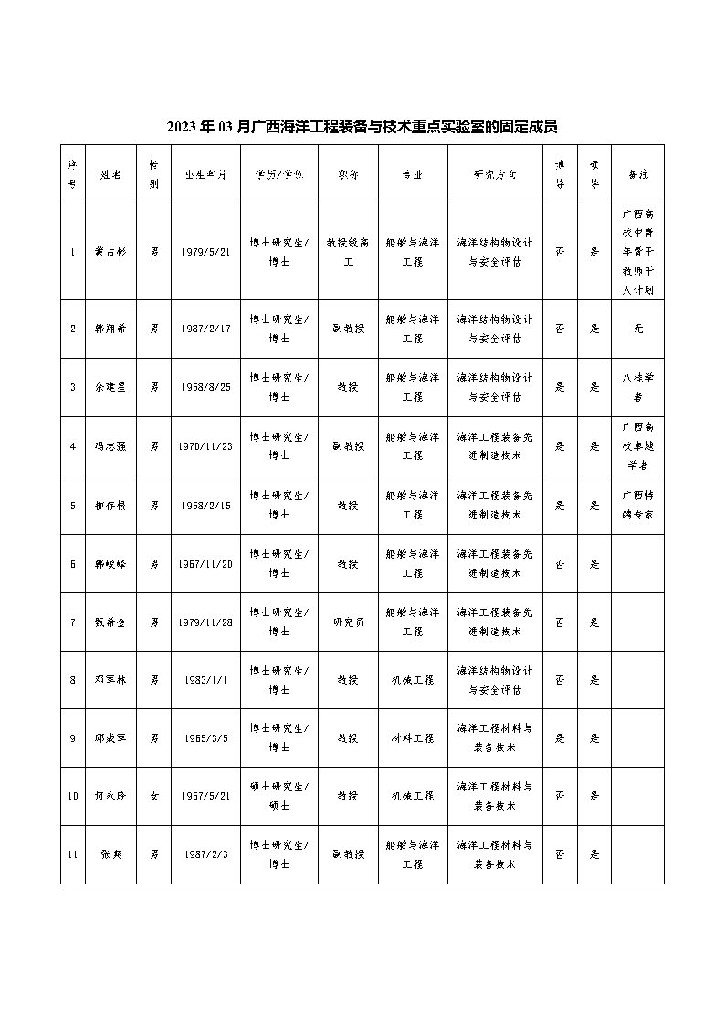 2023年03月广西海洋工程装备与技术重点实验室的固定成员