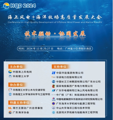 2024年12月25日至27日,由中国海上风电网与华南理工大学联合主办,北部湾大学机械与船舶海洋工程学院参与支持的2024海上风电+海洋牧场高质量发展大会(简称HQD2024)在广州市隆重召开。大会以“技术驱动·协同发展”为主题,通过开幕致辞、主题演讲、嘉宾对话和企业展示等多种形式,深入探讨了海上风电与海洋牧场的技术创新、协同发展策略及未来趋势。