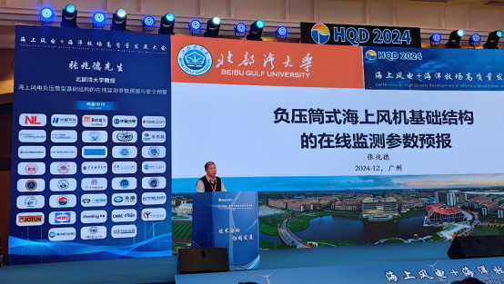 广西海洋工程装备与技术重点实验室固定成员韩翔希副院长和张兆德教授出席了本次大会,并积极参与了相关讨论。张兆德教授在会上作题为《负压筒式海上风机基础结构的在线检测参数预报》的主题演讲。他详细介绍了负压筒式海上风机基础结构的特点及其在线检测技术,并分享了最新的研究成果和应用案例。张教授的演讲引起了与会专家和学者的广泛关注,大家纷纷就相关技术问题进行了深入交流和探讨。