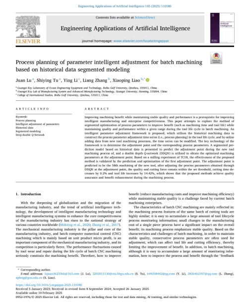 近日,广西海洋工程装备与技术重点实验室固定成员鲁娟教授作为第一作者,以北部湾大学为第一单位,在国际顶级期刊《Engineering Applications of Artificial Intelligence》上发表学术论文《Process planning of parameter intelligent adjustment for batch machining based on historical data segmented modeling》。《Engineering Applications of Artificial Intelligence》是计算机科学领域的国际权威学术期刊,在最新的中科院SCI分区为1区TOP期刊,2024年影响因子为7.5。