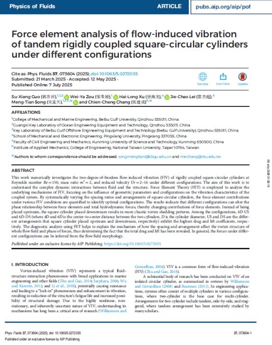 近日,机船学院宋孟天老师为通讯作者,在流体力学领域国际著名期刊《Physics of Fluids》上发表学术论文《Force element analysis of flow-induced vibration of tandem rigidly coupled square-circular cylinders under different configurations》。《Physics of Fluids》是一本致力于报道流体力学理论、实验和数值模拟方面最新进展的学术期刊,在最新中科院SCI分区为2区,JCR分区为Q1,影响因子为4.3。